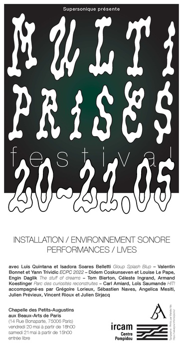 Créée en 2020 à l’initiative des Beaux-Arts de Paris, en collaboration avec l’Ircam, la chaire Supersonique « exposer, monter, habiter le son », se présente comme un atelier de partage des outils et des pratiques pour composer l’espace sonore, visuel et sensible. Des compositrice.teur.s issus du Cursus de composition et d’informatique de l’Ircam et des étudiant.e.s des Beaux-Arts de Paris ont travaillé ensemble tout au long de l’année pour imaginer et composer des œuvres sonores, visuelles et performatives. Pour cette 2e édition, les artistes participant à la chaire Supersonique sont invités à présenter leurs créations dans un lieu remarquable et chargé d’histoire : la chapelle des Petits-Augustins des Beaux-Arts de Paris.