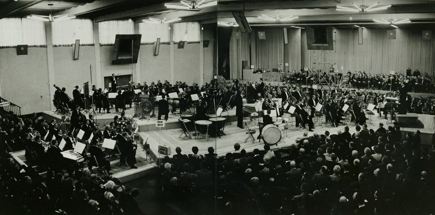 Le tableau, en l’occurrence, c’est l’unique enregistrement existant, celui de la création de l’œuvre, réalisé avec un seul microphone placé dans la salle, qui captait en même temps les trois orchestres, l’électronique diffusée autour du public par une vingtaine de haut-parleurs, l’acoustique de la salle et les bruits parasites de l’environnement ! Du fait de la spatialisation, cet enregistrement est particulièrement peu à même de restituer le détail de l’électronique.