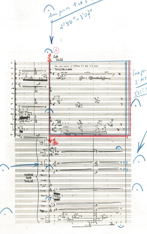 Enfin, l’enregistrement monophonique ne permettant guère de percevoir correctement la spatialisation originale, nous avons, grâce à l’aide d’Angela Ida de Benedictis, consulté les esquisses de Boulez à la Fondation Paul Sacher à Bâle et pris en compte la thèse de doctorat d’Ai Higashikawa sur l’électronique de Poésie pour pouvoir, ainsi que les partitions utilisées par les chefs : elles nous donnent des indices, surtout en ce qui concerne la partie vocale, qui était diffusée par un haut-parleur rotatif placé en hauteur au milieu du public. Par rapport à 1958, la technologie de spatialisation et des haut-parleurs a tellement évolué que nous pensons pouvoir proposer une interprétation contemporaine de l’espace original qui soit plus proche des souhaits du compositeur, connaissant la façon dont il les a réalisés ultérieurement – à partir de Répons.