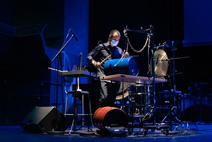 Photo : Benjamin Lévy lors du concert Mécaniques de l'intuition au Centre Pompidou, mars 2021 © Pierre Gondard