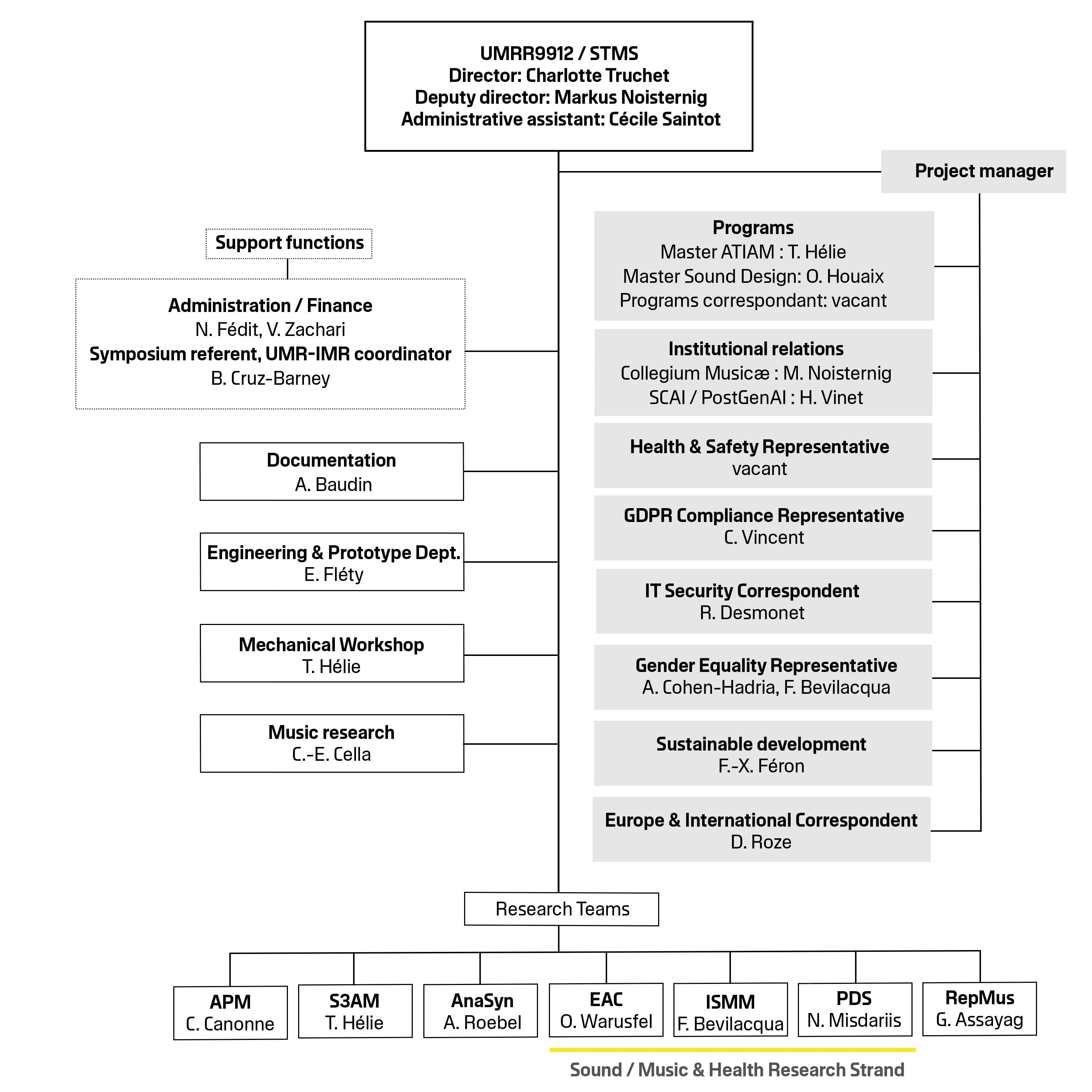 The UMR9912 STMS Research Lab, founded in 1995 and hosted by IRCAM, brings together the CNRS, Sorbonne University, the French Ministry of Culture, and IRCAM around the theme of multidisciplinary research on science and technology for music and sound. The lab is connected with the CNRS INS2I (main), and INSHS as well as the Sorbonne University engineering school.