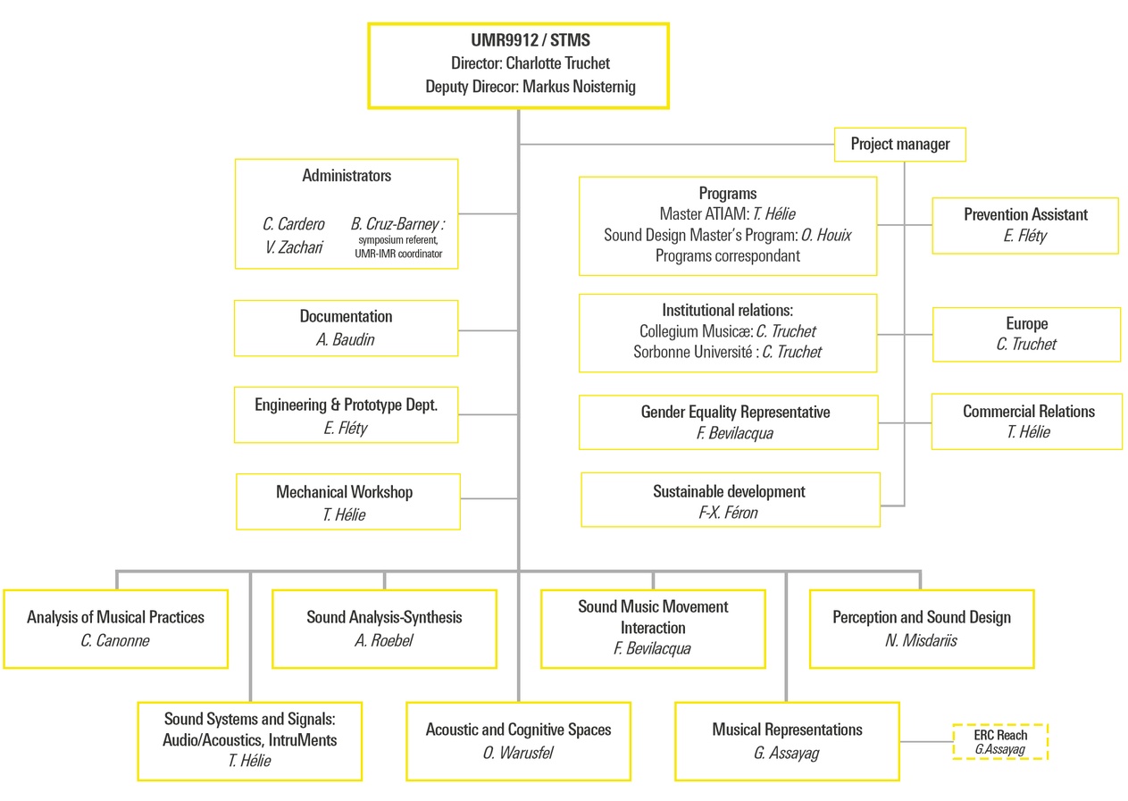 L’UMR est structurée en 7 équipes, qui se caractérisent par leurs ancrages théoriques et les objets étudiés ; ses activités s’organisent autour de 3 champs d’interaction, couvrant tout le spectre des sciences et technologies de la musique et du son : l’atelier du son, le corps musicien, les dynamiques créatives.