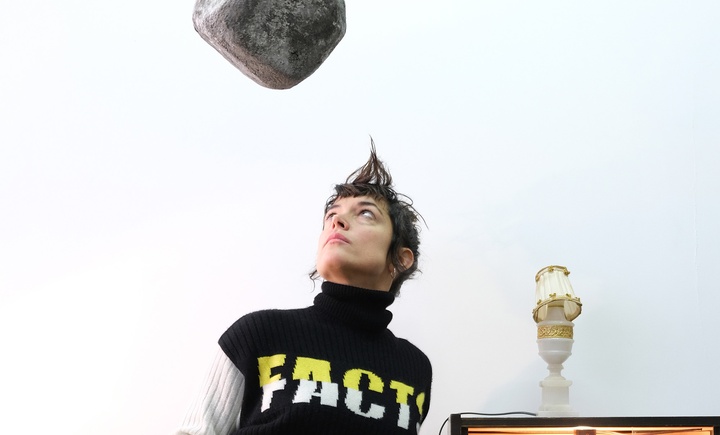 « Dans cette création, tout est parti des objets – ces objets que je porte sur la tête : une pierre, une malle, une voiture. Et comme je n’arrivais pas à construire cette voiture, je me suis surprise à écrire …